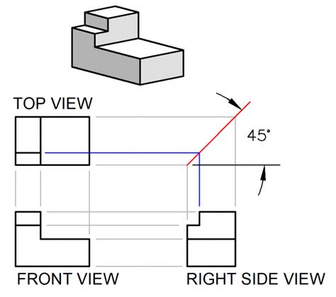Draw light projection lines from the top view to the miter line, then vertically downward from the point where they intersect the miter line. A right side view tells you everything you need to know except. A miter line (oe in the figure) offers a convenient method of laying out a third view while you are in the process of drawing two views. What is an exploded axonometric?